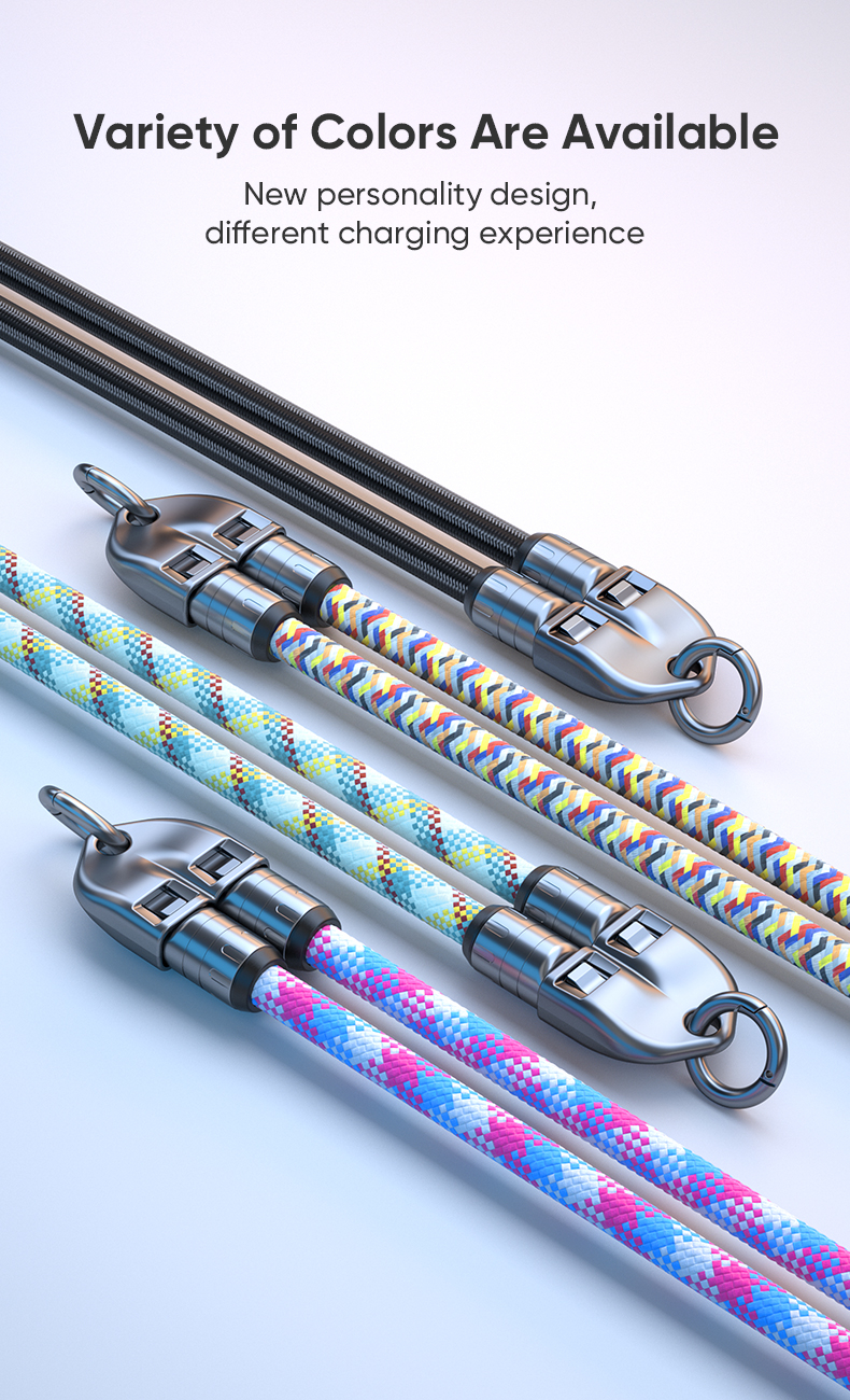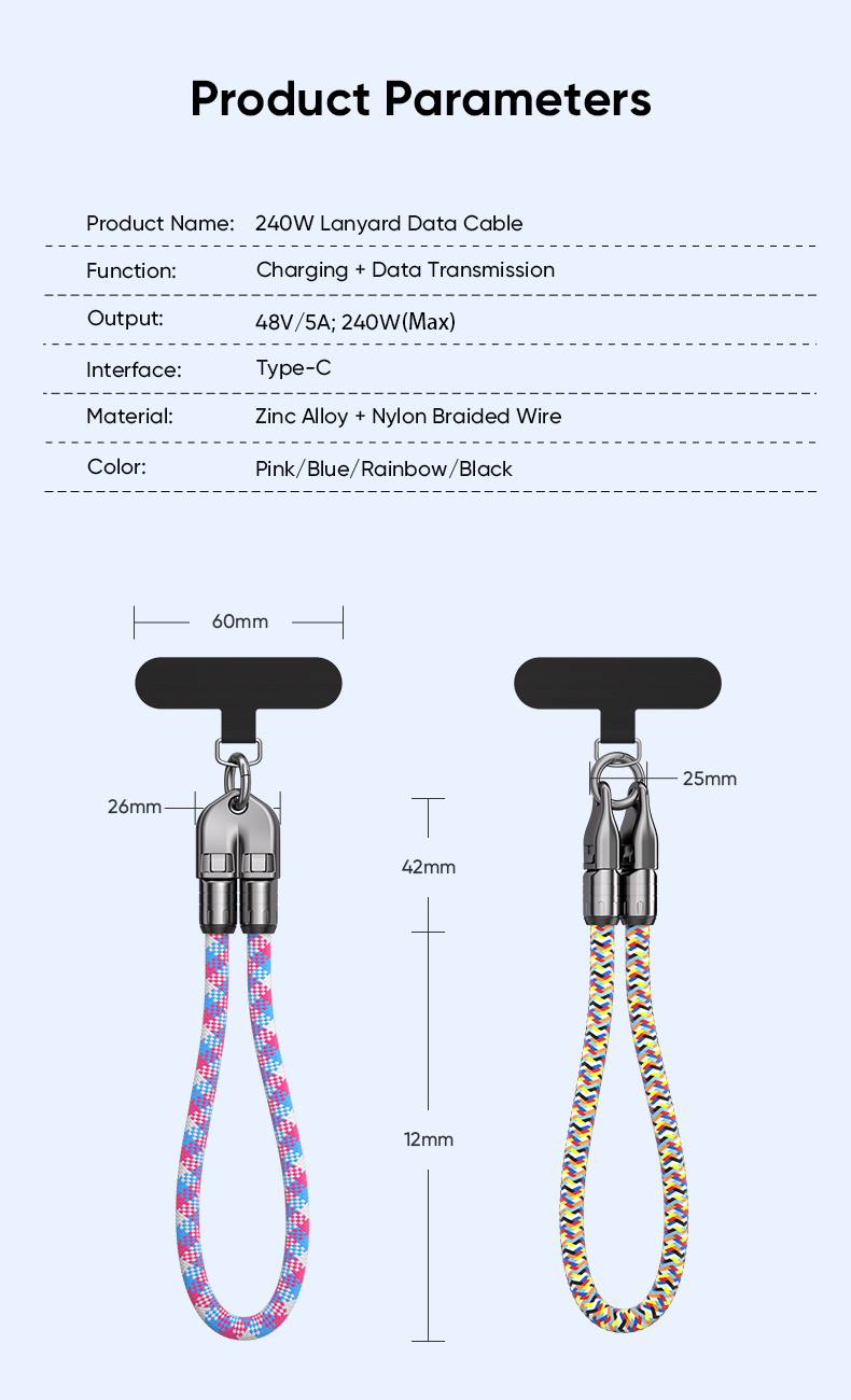 Cablu USB-C la USB-C cu încărcare ultra rapidă 240W PD, conceput pentru telefoane, laptopuri și tablete moderne. Designul 2 în 1 cablu + lanyard îți permite să îți porți telefonul în siguranță sau să îl atașezi la rucsac sau bicicletă.